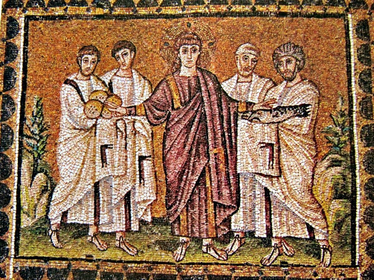 - Mosaïque, 6e siècle, Basilique Saint-Apollinaire-le-Neuf, Ravenne, Italie. Dans cette église ancienne, les nombreuses mosaïques, un art majeur de l’Antiquité, présentent des scènes bibliques. Jésus, jeune homme royal, au nimbe cruciforme et au vêtement pourpre, est entouré de quatre disciples en blanc. Tous portent de fines sandales sur un sol aux mosaïques vertes. Les bras de Jésus sont en croix. Il tient en mains deux poissons et quatre pains. Serait-il lui-même le cinquième pain?