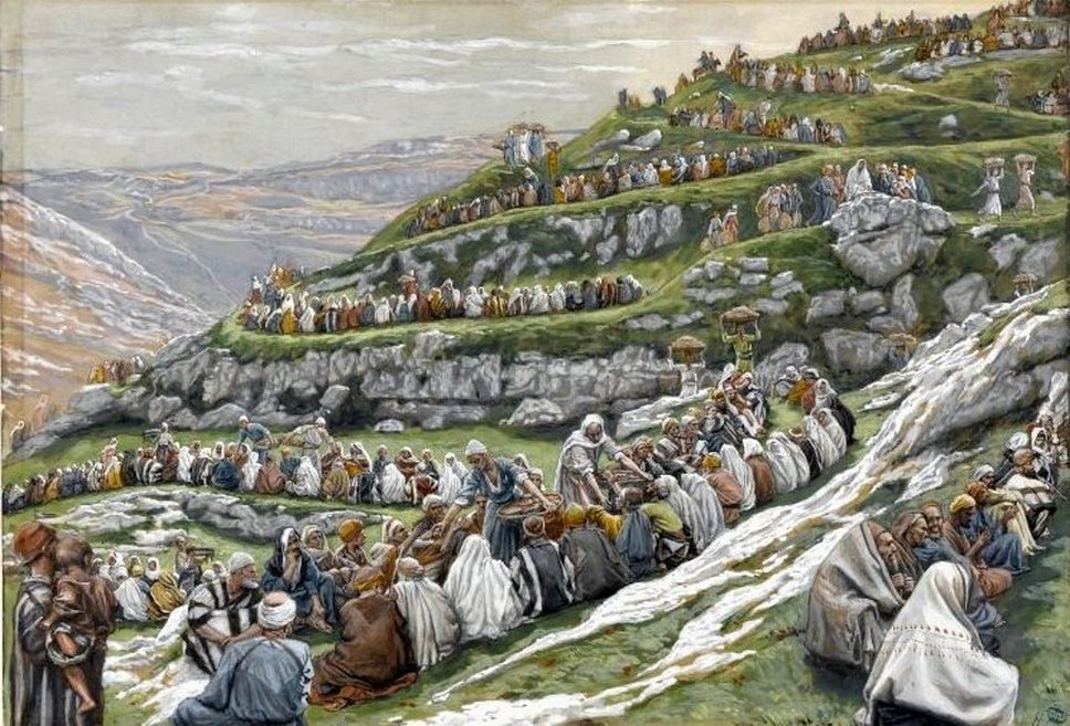 - James Tissot, c.1886-1894, Brooklyn Museum, États-Unis. Comme il arrive souvent, cet artiste français familier de la Terre Sainte et de cette chronique a un point de vue original. Dans cette région montagneuse, toute une colline est utilisée pour y répartir la foule nombreuse en groupes plus restreints, assis sur l’herbe verte. C’est très bien organisé, avec toute une équipe au travail qui assure le transport et la distribution des pains et poissons. Parmi les apôtres, il y avait des gestionnaires pratiques, des intendants avisés! Jésus est vers le haut à droite, avec son châle blanc, fréquent chez Tissot, assis devant un rocher, rompant le pain.