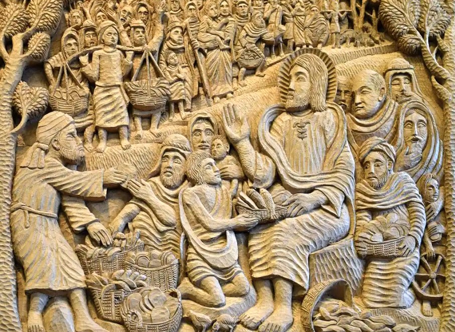 - Balavendra Elias, sculpture sur bois, 21e siècle, St. George’s Church, Hangleton, East Sussex, Angleterre. Ce sculpteur, originaire des Indes, vit en Angleterre depuis ses dix-huit ans. Il réside à Brighton. La sculpture, en chêne et en if, se trouve dans une église catholique qui contient plusieurs œuvres d’art, dont une série de sculptures sur la vie du Christ. Au centre, on voit le garçon aux pieds de Jésus, lui présentant les pains et poissons que Jésus, assis, reçoit et bénit. Les disciples vont les distribuer à la foule, qui attend à l’arrière. Il y a tout un travail derrière cette œuvre expressive.
