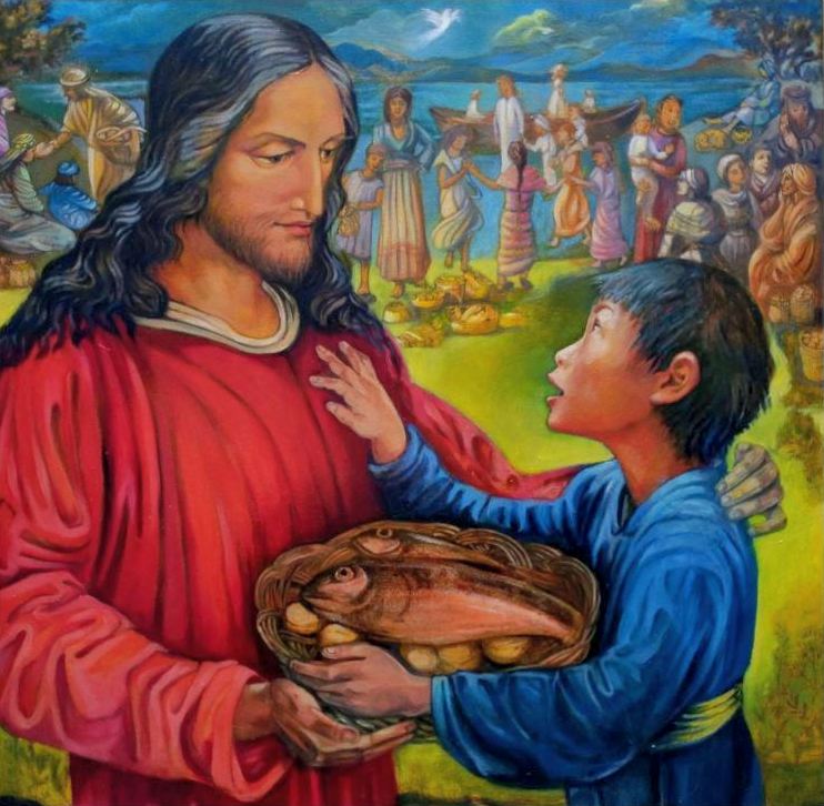 - Anne-Marie Forest, 2022, site racef.art, Canada. Cette artiste et catéchète, de Joliette, est membre et co-fondatrice du Racef (Réseau art chrétien et éducation de la foi). Cette œuvre fait partie de l’Exposition Mamo, Vivre le portage ensemble. Le garçon regarde Jésus avec grande attention et lui offre les deux poissons et cinq pains. Sa main touche le cœur de Jésus qui lui touche l’épaule. L’enfant est vêtu de bleu et jaune, aux couleurs de l’Ukraine, et ses traits sont ceux du peuple Atikamekw, auprès de qui l’artiste est engagée. Au second plan, un canot est prêt pour une randonnée sur le lac et on voit, près des paniers, des familles heureuses de se retrouver ensemble. Voici une oeuvre émouvante, qui donne le goût de se joindre à ce pique-nique au bord du lac, sur l’herbe verte, pour partager le pain et sa fraternité …