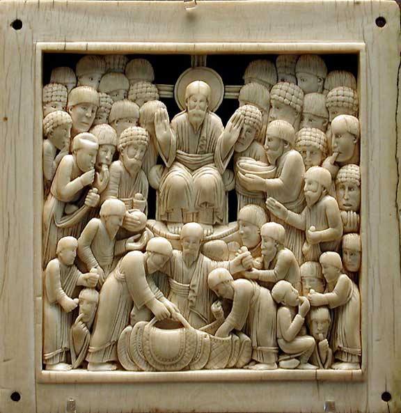 - Plaque d’ivoire, c.968, Musée du Louvre, Paris, France. Cette oeuvre vient de l’Atelier du groupe de Magdebourg. Elle a été offerte par l’empereur Otton 1er au monastère Saint-Maurice de Magdebourg. Elle est un antependium (devant d’autel), de petite dimension : 12,2 cm de hauteur, 12 cm de largeur, 0,5-0,8 cm d’épaisseur. Elle faisait partie d’un ensemble dont 16 plaques subsistent. Au centre, Jésus assis et nimbé, mains levées, est en train de bénir. En bas, des disciples s’occupent de la distribution. Autour du Christ, des gens qui mangent, proches les uns des autres. Le tout est vivant et entraînant.