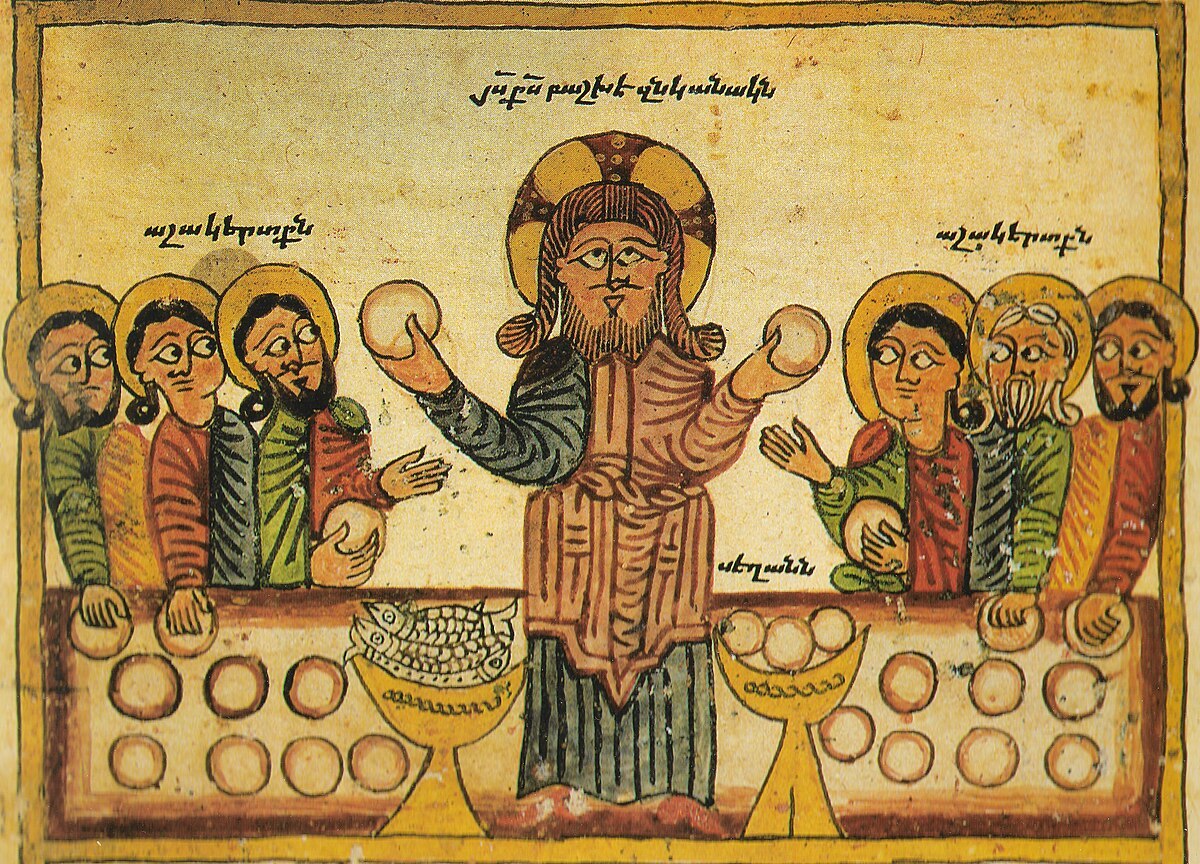 - Miniature, 1433, Evangile de Daniel d’Uranc, n° 1963, folio 2v, Matenadaran (Institut Mesrop Machtots sur les Manuscrits Anciens), Erevan, Arménie. Dans cet Institut, se retrouvent des milliers de manuscrits arméniens. Celui-ci, du 15e siècle, comprend plusieurs miniatures de scènes évangéliques. Ici, Jésus, debout au centre, les yeux levés au ciel, tient deux pains en mains. Les trois autres sont dans le panier à droite; les deux poissons dans celui de gauche. Six disciples, dont Jean, Pierre et Jacques, à droite, sont aux côtés de Jésus. Ils s’apprêtent à distribuer la nourriture à la foule : chacun a en main un pain.
