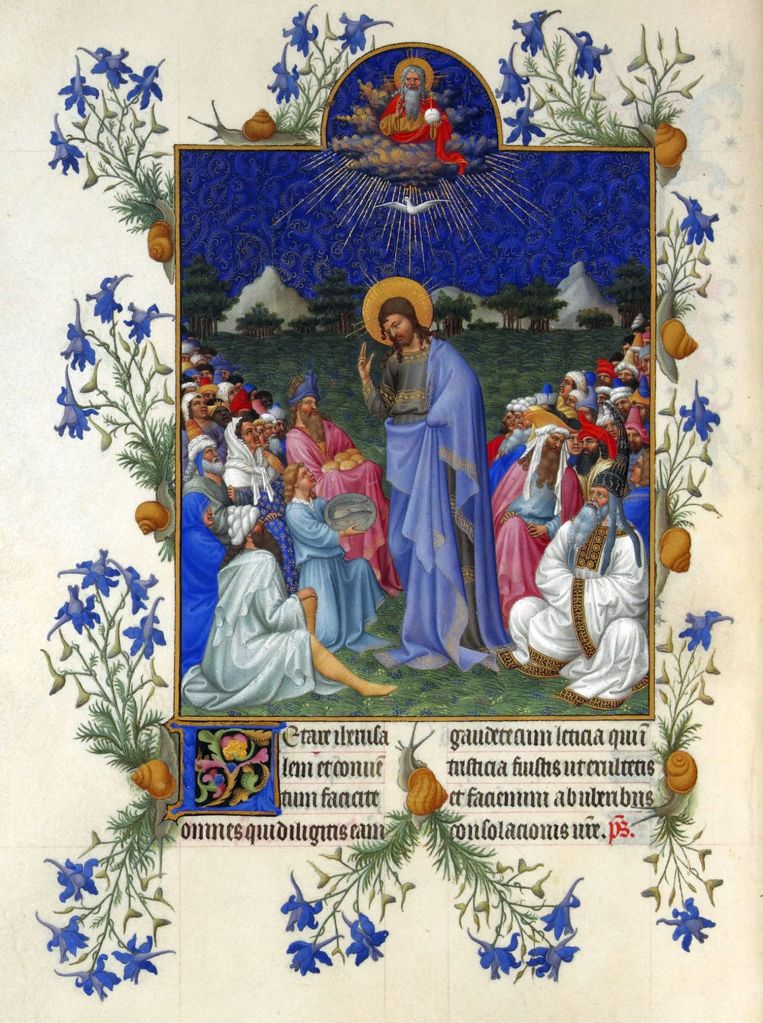 - Miniature, c.1411-1416, Les Très Riches Heures du duc de Berry, Ms 65, folio 168v, Musée Condé, Chantilly, France. Le manuscrit comprend 66 grandes miniatures et 65 petites. Les plus anciennes ont été faites par les frères de Limbourg (Paul, Jean, Herman). Ces artistes, originaires de Nimègue, utilisent une grande variété de couleurs; le bleu est très présent. Les paysages s’inspirent de lieux français. Cette grande miniature, attribuée à Herman, fait partie des Heures de l’année liturgique. On y voit le garçon avec les deux poissons et l’apôtre André avec les cinq pains. La foule est assise sur l’herbe verte. Élément plus rare, toute la Trinité est présente : le Père au ciel sur des nuées, l’Esprit comme une colombe, et le Fils, debout et bénissant.
