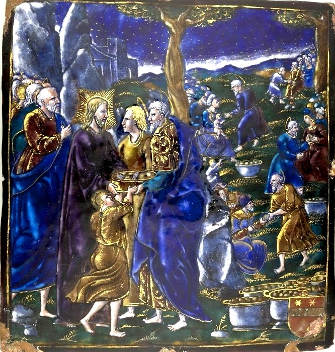 - Colin Nouailher, plaque d’émail, c.1560-1570, Musée du Louvre, Paris, France. Cet émail (hauteur de 25,8 cm et largeur de 23,9 cm), fabriqué par un des grands experts de Limoges, était présent dans la chronique sur l’apôtre André. On voit celui-ci qui sert d’intermédiaire entre le garçon, doré et auréolé, avec ses cinq pains et deux poissons, et Jésus, rayonnant. L’enfant les remet à André qui les remet à Jésus. La suite est aussi présentée : la distribution des pains et poissons, par des disciples auréolés, aux gens répartis en groupes, dont un pèlerin de Compostelle (coquille au chapeau), vers l’avant à droite. L’herbe est bien verte. En bas, des armoiries devant les corbeilles qui restent. Dans certaines légendes, l’enfant est identifié à saint Martial de Limoges.