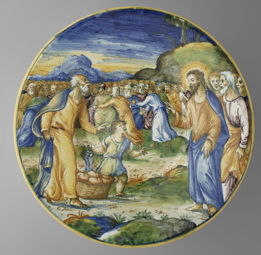 - Assiette de faïence, 1565-1570, Musée du Louvre, Paris, France. Cette assiette provient de l’atelier de céramique de Domenego da Venezia, à Venise. Il s’agit d’une majolique (faïence italienne). La scène en Jean est reprise : André et le garçon avec les cinq pains et deux poissons se tiennent devant Jésus, debout et bénissant, Pierre à son côté. Le cadre est rural. Au fond, les disciples commencent à organiser la foule. On imagine très bien un pain et un poisson dans cette assiette.
