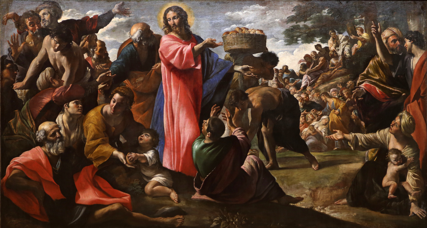 - Giovanni Lanfranco, c.1624-1625, National Gallery of Ireland, Dublin, Irlande. Ce peintre et graveur de Parme, formé à Rome chez Carraci, s’est inscrit dans le courant baroque, avec son mouvement et ses contrastes. Il fut très actif, avec succès, dans les églises et palais, particulièrement dans les coupoles. Jésus, debout au centre, portant le pain et bénissant, est entouré d’une foule serrée et affamée, comprenant des mères avec enfants et des gens âgés. Des disciples à l’arrière distribuent la nourriture. À droite, deux hommes debout sont en discussion, l’un indiquant le ciel de sa main. La scène est très animée.