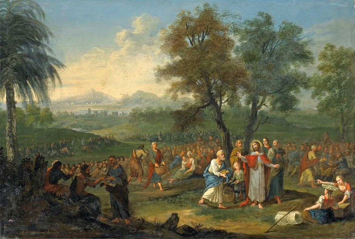 - Heinrich van Waterschoot, c.1730-1745, site wikipedia.org. L’emplacement de cette œuvre n’est pas identifié. Son auteur, un peintre flamand, est peu connu; il est mort en 1748, à Munich en Allemagne. L’art du 18e siècle s’est intéressé à la nature, comme environnement des activités humaines mais aussi pour elle-même. Ici, il y a enfin assez d’espace pour une foule de quelques milliers de personnes. La journée est belle, le vert prédomine. On voit au loin la ville et les collines. André et le garçon sont près de Jésus, avec pains et poissons. Jésus debout est en prière, les mains étendues. La foule est regroupée en tablées et les disciples commencent la distribution. Ce souper sur l’herbe sera mémorable.