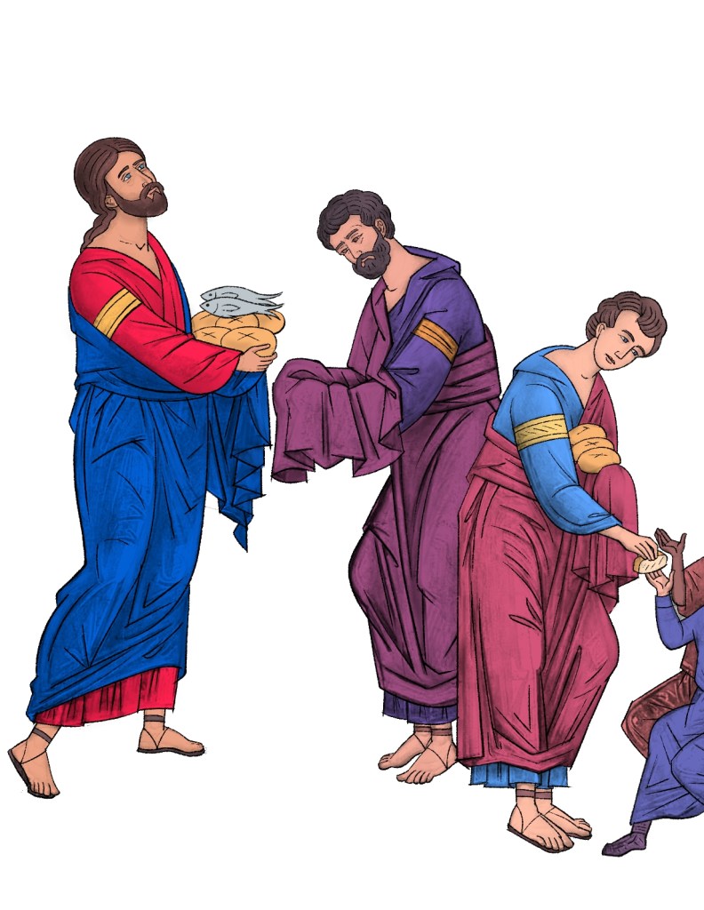 L’échange avec les disciples met en relief une dimension très intéressante. Deux logiques y sont présentes: celle de l’achat et celle du don. Les disciples pensent que la foule doit se débrouiller toute seule et aller s’acheter de la nourriture. Jésus propose que les disciples donnent le peu qui est déjà là, les cinq pains et deux poissons. C’est ce qui advient: le peu est donné, partagé. Paradoxalement, il devient source d’abondance. Comme si le don était créateur, comme si le partage construisait une communauté humaine et sacramentelle.