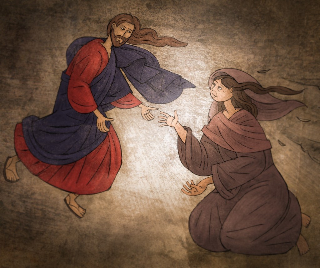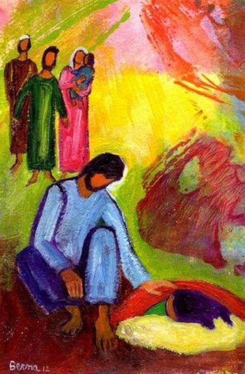 James L. Johnson, 2018, site jamesjohnsonart.com, États-Unis. Cet artiste du Montana fait des œuvres religieuses ainsi que des paysages. Ici, la scène est centrée sur Jésus et la femme, qui a l’air jeune. Elle est déjà relevée, souriante et pleine de reconnaissance, comme son regard l’exprime, envers Jésus qui lui tient la main. Les deux sont vêtus de blanc. Quatre autres figures sont présentes, discrètement, dont l’une près de la femme. Et peut-être aussi, vous et moi, étonné-e-s et invité-e-s à nous lever et à servir …