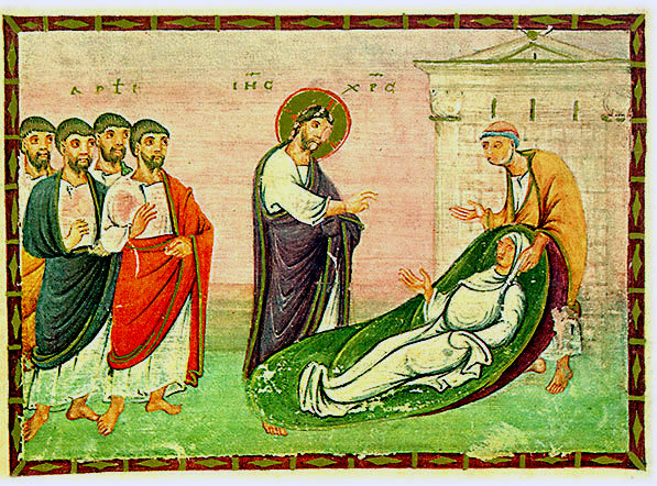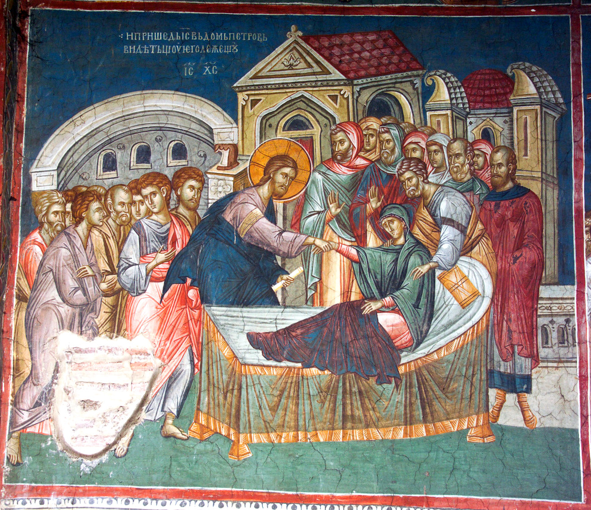 Fresque, c.1340-1350, Église du Monastère Visoki Decani, Kosovo. Cette immense église médiévale relève de l’Église orthodoxe-serbe. Elle comprend de nombreuses fresques. Dans celle-ci, il y a beaucoup de monde! Jésus est le Maître, avec le rouleau de la Parole, mais il est en mouvement; il se penche vers la femme dont il prend la main. Celle-ci, dans un lit imposant, se relève et nous regarde. Pierre est derrière elle, suivi des onze autres apôtres. À gauche, neuf figures regardent et commentent l’événement. Les vêtements et les couleurs sont raffinés. Le tout est situé dans une architecture élaborée.