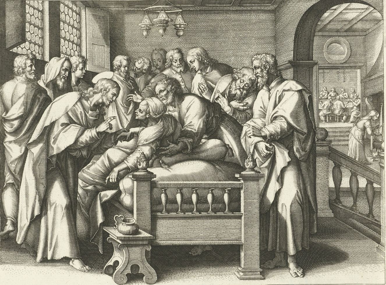 Jacques de Bie, gravure, c.1598-1618, Musée des Beaux-Arts de Gand, Belgique. Cet artiste d’Anvers fut un numismate et un graveur. Il a travaillé aussi à Bruxelles et Paris. Cette gravure fait partie d’une série sur la vie du Christ, réalisée avec quatre autres graveurs, à partir des œuvres du peintre flamand Maerten de Vos (1532-1603). Jésus prend la main de la femme, assise sur un lit; Pierre derrière elle la soutient. Ces trois figures sont entourées par dix autres, en conversation. À droite, sept personnes sont à table dans une salle, pendant qu’une femme prépare le repas. L’intérieur de la maison est montré avec détails. Elle est grande et bien équipée. Au plafond, trois bougies; à droite, le feu du foyer.