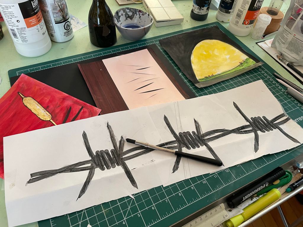 Du rouge pour évoquer la pourpre royale. Un roseau en guise de sceptre où j’ai mis de la feuilles d’or pour en faire un véritable insigne monarchique en dérision des moqueurs. À la place des épines, du fil barbelé avec ce qu’il peut évoquer de cruauté dont sont victimes ces femmes, ces hommes, ces enfants qu’on enferme dans des camps de réfugiés.