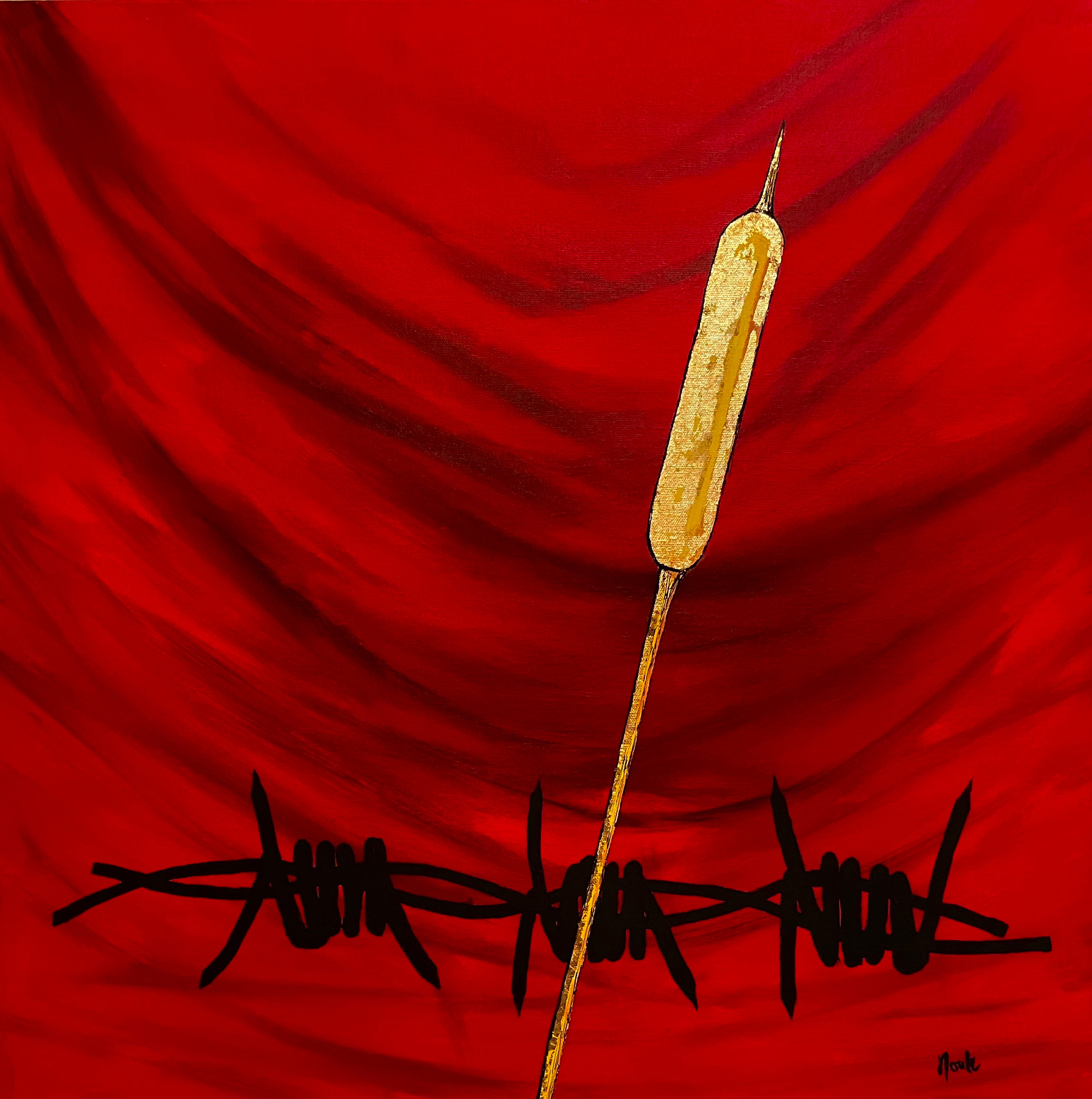 Pour une autre série de tableaux inspirés cette fois de la Passion du Christ et de sa Résurrection, j’ai cherché à réduire la représentation en ne retenant que des objets, une sensation ou un contraste lumineux. Dans une toile évoquant la dérision dont Jésus est victime, du rouge suggère la pourpre royale. J’y ai esquissé un roseau en guise de sceptre que j’ai recouvert de feuilles d’or pour en faire un véritable insigne monarchique en dérision des moqueurs. À la place d’épines pour tresser une couronne du fil barbelé avec ce qu’il peut évoquer de cruauté dont sont victimes ces femmes, ces hommes, ces enfants qu’on enferme dans des camps de réfugiés.