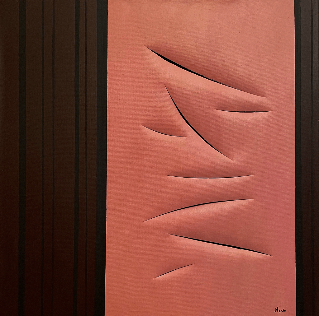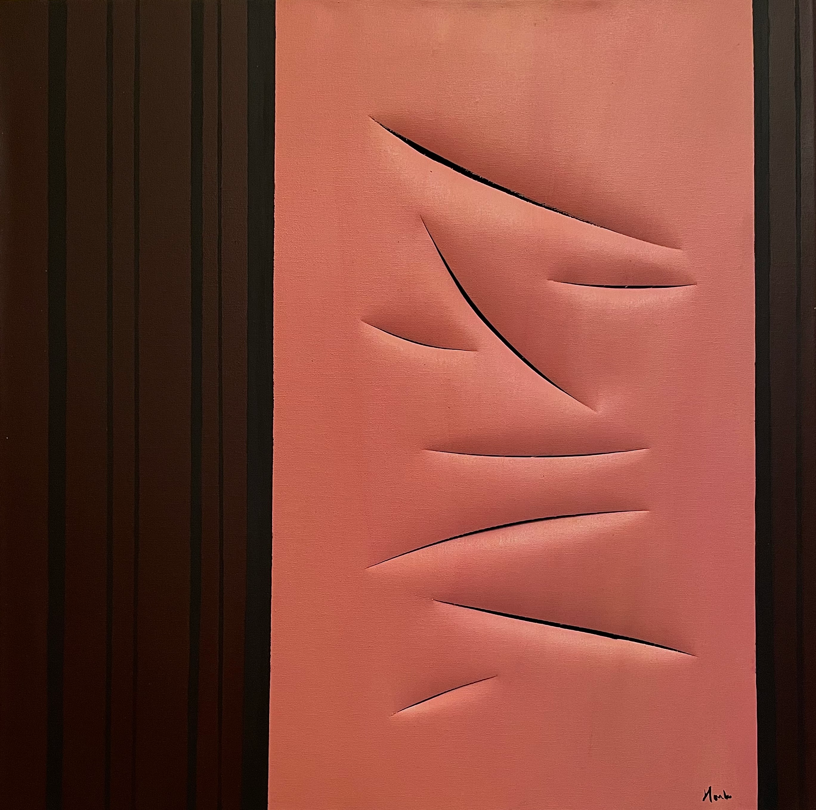 Pour rappeler la flagellation de Jésus, son corps meurtri et blessé s’est imposé pour se retrouver dans la facture même de la toile. Une large portion est de couleur chair. Je l’ai littéralement lacérée. Un jeux de bandes latérales rappelle des lanières tachées de sang. Je voulais que ce soit à la fois réaliste comme l’a été la matérialité des faits mais évoquée avec la sobriété du récit. D’ailleurs les récits de la Passion sont d’une retenue et d’une discrétion qui toujours m’impressionnent.