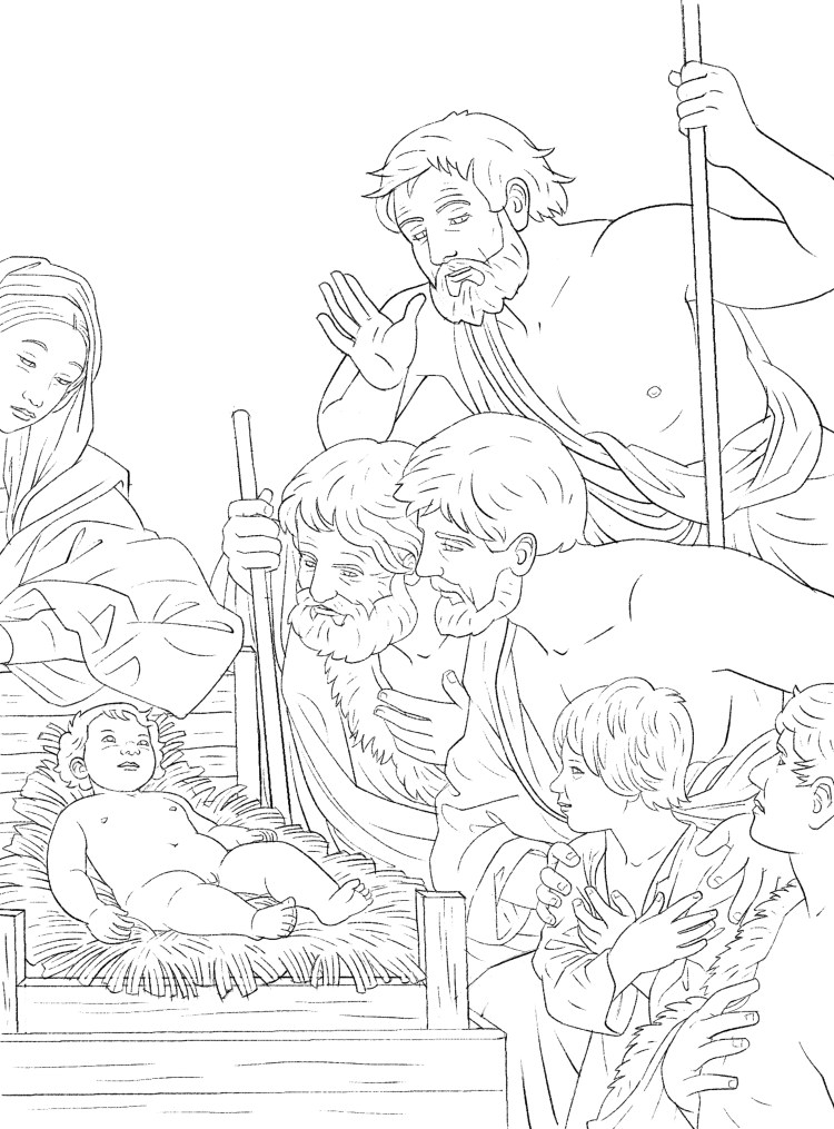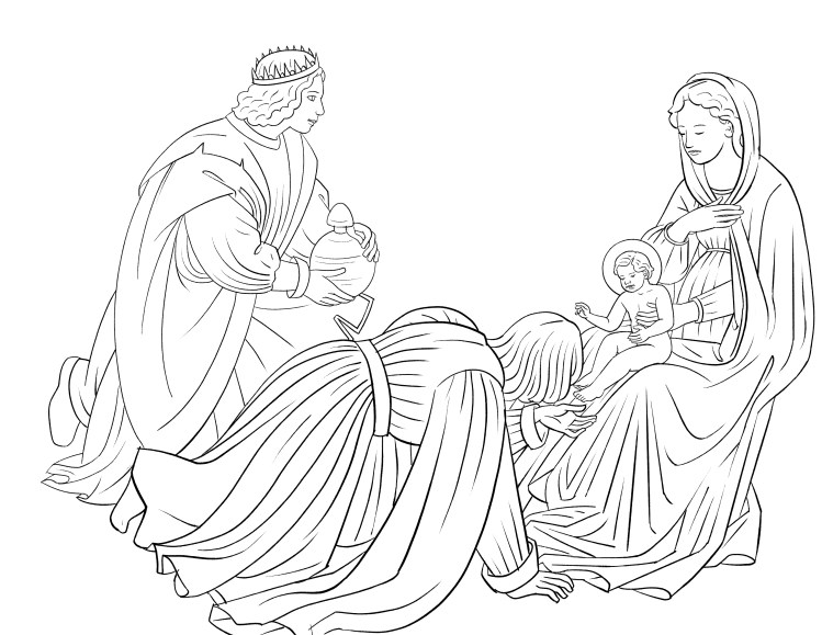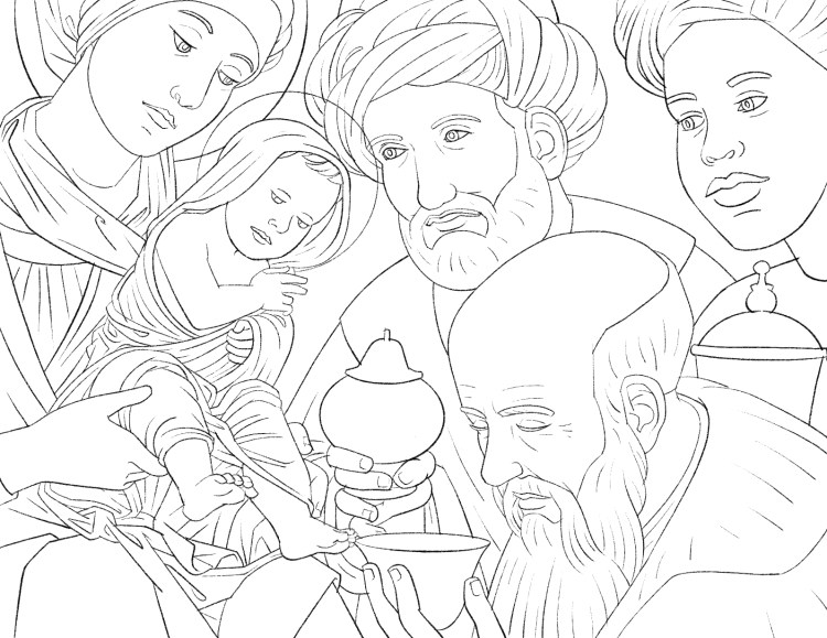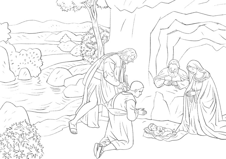 Prosternation des rois mages inspirée d’une oeuvre d’Andrea Mantegna, modèle simplifié à tracer et à colorier