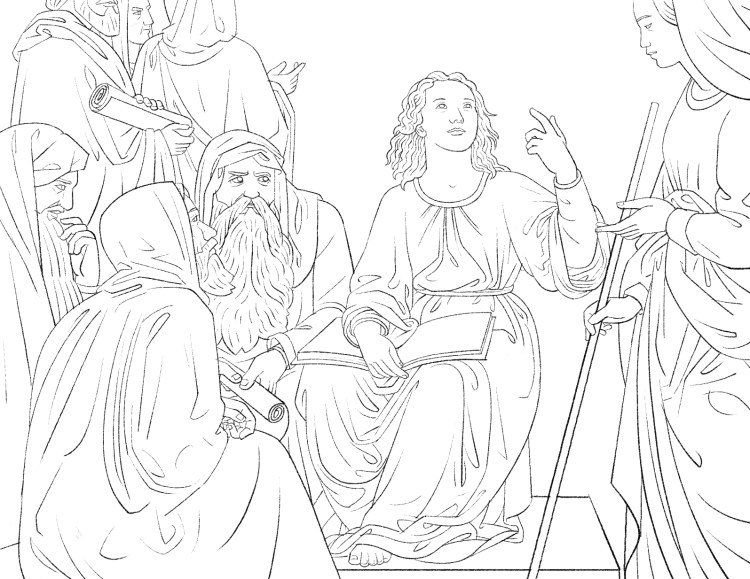Jésus à l’age de 12 ans, au milieu des docteurs de la loi. Image librement inspirée d’une ancienne illustration