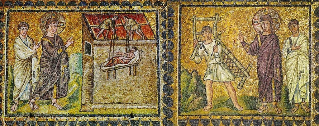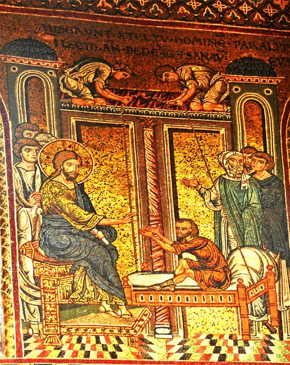 - Mosaïque, 12e -13e siècle, Basilique Saint-Marc, Venise, Italie. Dans cette cathédrale de style byzantin, se trouve un des plus grands ensembles de mosaïques au monde. Celle-ci présente la séquence de Matthieu. Le petit diable, avec ailes et cornes, n’a pas l’air très malin! Jésus est plus grand que lui. À gauche, à Jésus assis sur un rocher, il offre les pierres à changer en pain; au centre, Jésus est au sommet du temple; à droite, il est sur la montagne. Là aussi, Jésus a en mains un rouleau de la Parole. En bas, à droite, le diablotin est renvoyé, dénudé, alors que trois anges, impressionnants et grands, s’approchent.