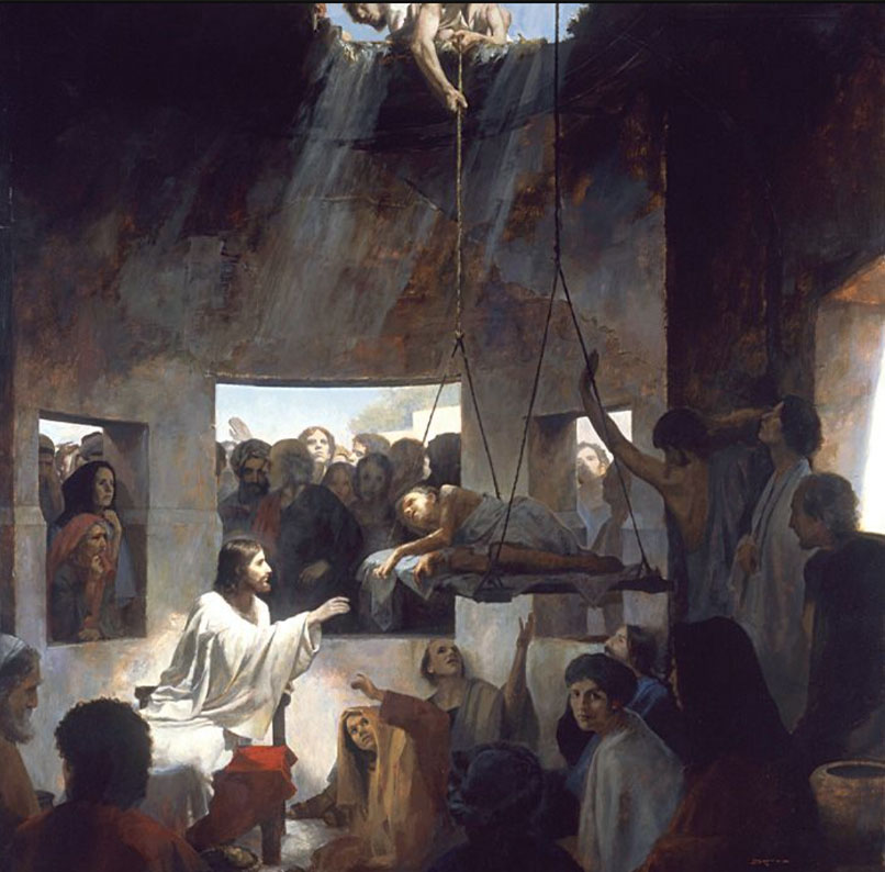 - Chris Cook, 2003, site chriscookartist.com, États-Unis. Ce peintre et illustrateur vient de la Georgie, au sud des États-Unis. Il s’inscrit dans le courant américain de l’expressionisme du Sud (Southern expressionnism), marqué par des couleurs fortes, de larges coups de pinceaux et des formes à la frontière du figuratif. Il a fait plusieurs œuvres d’inspiration chrétienne. Face à l’adversaire monochrome, Jésus s’avance, auréolé de lumière.