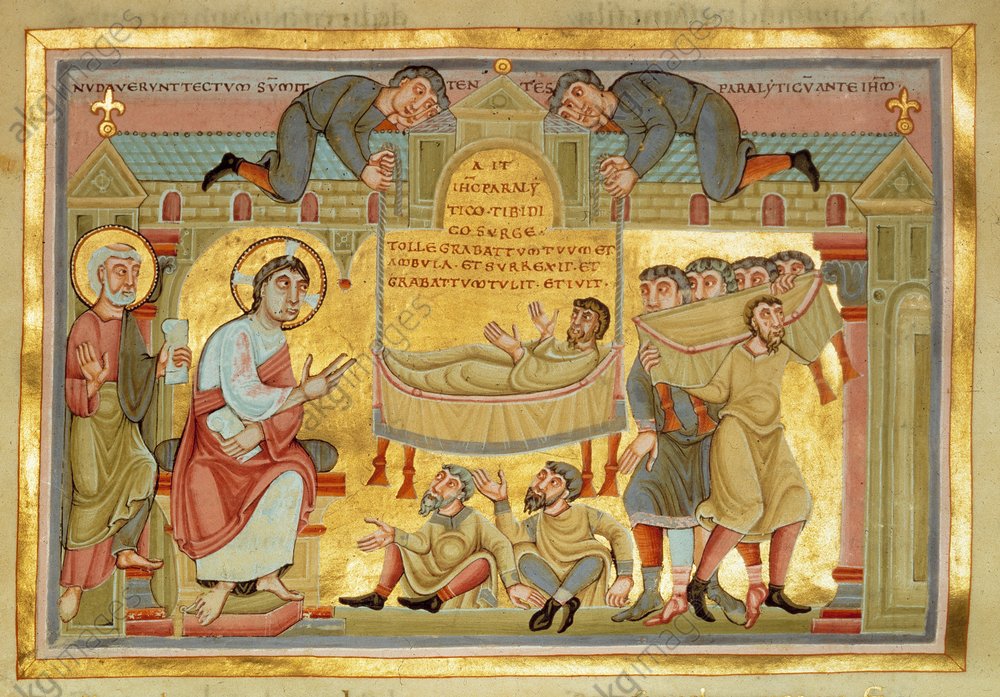 - Miniature, c.1020-1030, Codex Aureus Epternacensis, folio 20, recto, Musée National Germanique, Nuremberg, Allemagne. Ce manuscrit enluminé, écrit avec des lettres d’or, a été réalisé par le scriptorium de l’Abbaye d’Echternach, ville aujourd’hui au Luxembourg. Les tentations suivent l’ordre de Matthieu : le désert avec les pierres, l’édifice du temple, la montagne stylisée. Le Jésus imberbe et nimbé de l’Antiquité rencontre un diable ailé (ange déchu) et laid, qui s’agite. À chaque étape, Jésus a en mains un rouleau de la Parole; cela montre une bonne saisie du texte par l’artiste.