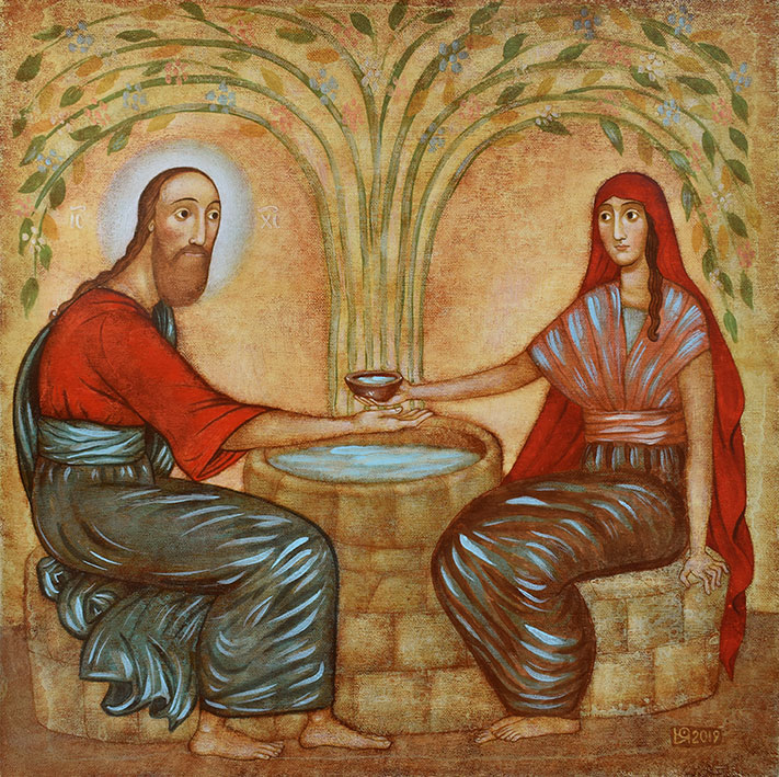 - Robert Lentz, icône, 21e siècle, site trinitystores.com, États-Unis. Ce franciscain, originaire du Colorado, a reçu une formation dans la tradition iconographique byzantine. Cherchant à renouveler cet art, il a écrit plusieurs icônes de saints et saintes et de figures contemporaines, qui sont très connues et utilisées. La Cananéenne (Syro-phénicienne), vive et résolue, main levée, avec sa bague et son bracelet, nous regarde.