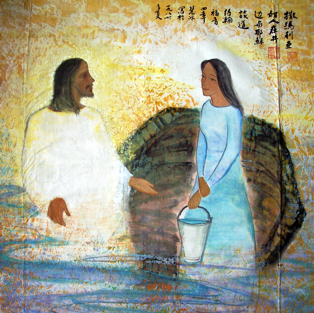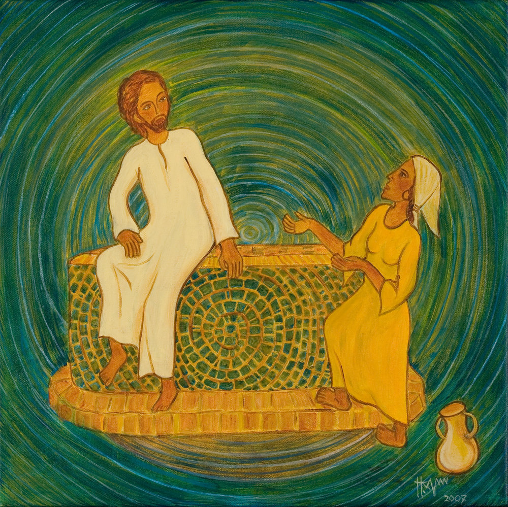 - Ally Barrett, 2017, site reverendally.org, Angleterre. Cette artiste britannique est prêtre de l’Église anglicane. Elle a été pasteure en paroisse et est maintenant aumônière d’un collège universitaire. Elle a publié plusieurs livres sur des questions pastorales. Ici, la Cananéenne, petite mais déterminée, touche Jésus pour qu’il écoute et saisisse sa demande. Un chien est présent, auquel s’accroche l’enfant. Des disciples sont proches de Jésus, dont deux plus visibles. À droite, la grand-mère prend soin des autres enfants, pour que la mère puisse faire sa demande à Jésus. Les pierres suggèrent ce qui peut faire tomber les petits (Mt 18,6). Le bleu de la robe évoque intentionnellement Marie, à Cana (Jn 2, 1-11) : « Marie, sa mère, lui a montré que son heure était venue et que le moment était venu pour lui d’accomplir son premier signe ».