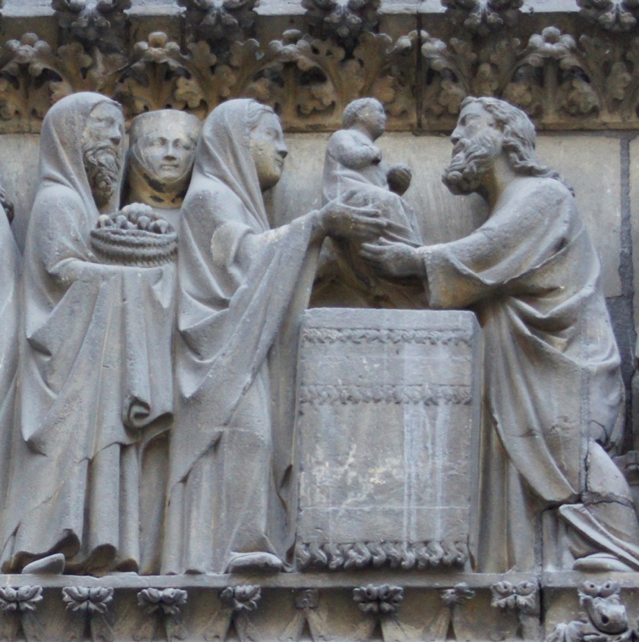 - Jean de Chelles, sculpture du tympan, c.1260, façade nord, portail du cloître, Notre-Dame-de-Paris, France. Cette œuvre est une des quatre scènes de l’enfance de Jésus. Marie soutient l’enfant et le présente à Syméon qui le prend, au-dessus d’une petite colonne. Joseph porte la corbeille des tourterelles. Anne, entre Joseph et Marie, est présente, dignement habillée comme une dame de son âge et de son rang.