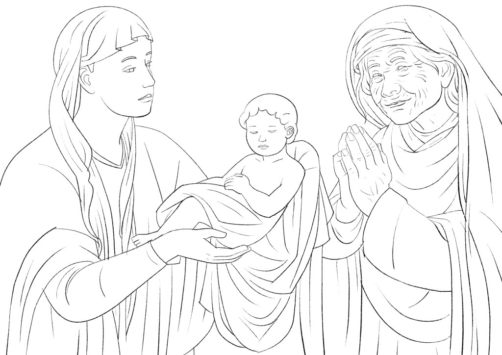 Vous pouvez utiliser une des images publiées dans cet article comme source d’inspiration, ou consulter les nombreuses images disponibles sur Internet sur le thème « Anne la prophétesse lors de la présentation de Jésus au temple », ou encore imprimer le modèle simplifié ci-dessous pour le tracer et le colorier.