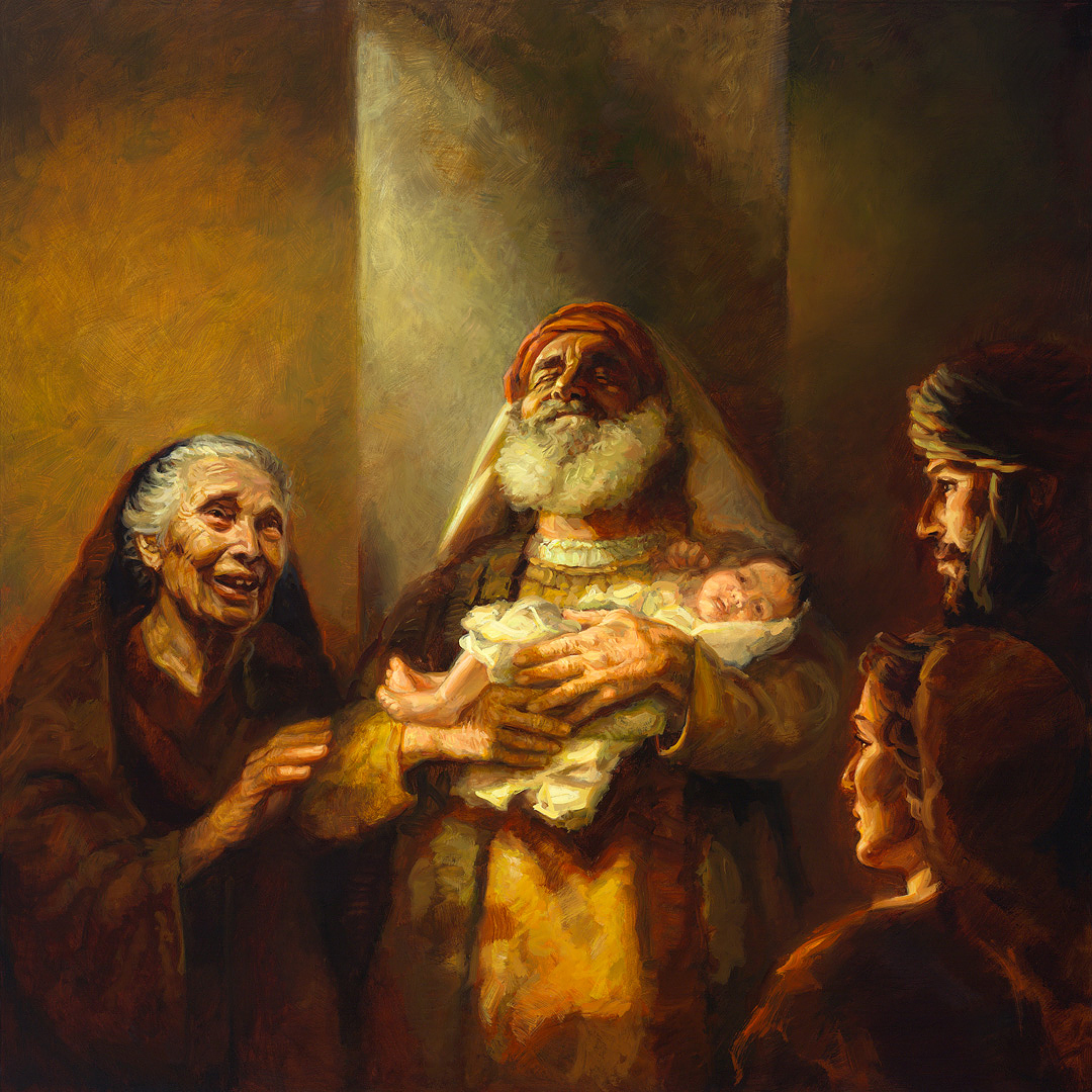- Jan van ‘t Hoff, 21e siècle, Dordrechtl, Pays-Bas. Cet artiste néerlandais, qui a son atelier dans la ville de Dordrechtl, a peint plusieurs scènes bibliques. Ici, Syméon et Anne, ces deux personnes âgées et espérantes, habitées par l’Esprit, sont visiblement remplies de joie. La source en est l’enfant au centre, paisible et lumineux. Les parents, à droite, sont attentifs. Le décor est simple, une colonne signifiant le Temple. Le visage d’Anne, la prophétesse ridée, est vraiment radieux. Elle nous invite à nous réjouir avec elle …