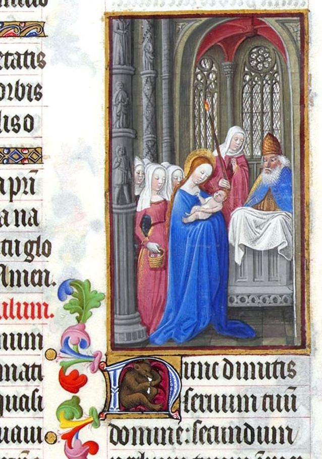 - Jean Colombe, miniature, Les Très Riches Heures du duc de Berry, folio 63r, 1485-1486, Musée Condé, Chantilly, France. Cette miniature fait partie de la section : Les heures de la Vierge. Avec ses dames de compagnie, dont l’une apporte les tourterelles, Marie porte l’enfant et le présente à Syméon, assis, avec un linge où déposer l’enfant sacré. Anne est à ses côtés portant le chandelier, au-dessus de l’enfant, lumière des nations. Joseph est retenu ailleurs, pris dans la circulation? Le tout se passe à l’intérieur d’une architecture d’église de l’époque. Le texte latin en bas de l’image est celui du Nunc dimittis, la prière de Syméon.
