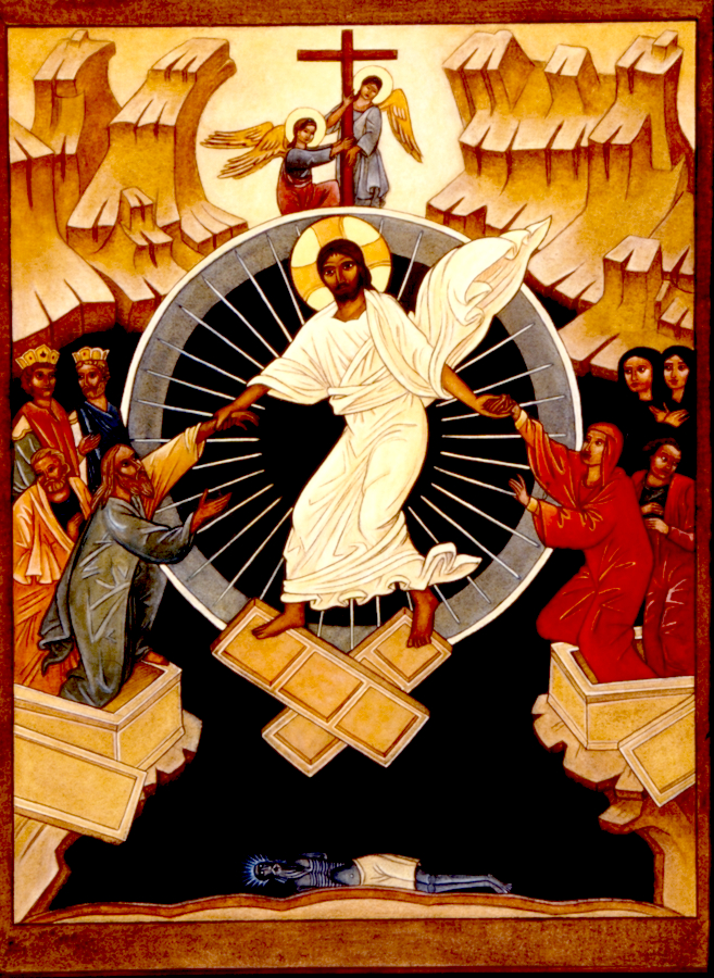 L’une des images centrales, incarnant avec force la résurrection de Jésus-Christ, est celle où Jésus remonte des enfers, brisant les portes de ceux-ci et entraînant avec lui celles et ceux qui y étaient retenus en captivité.