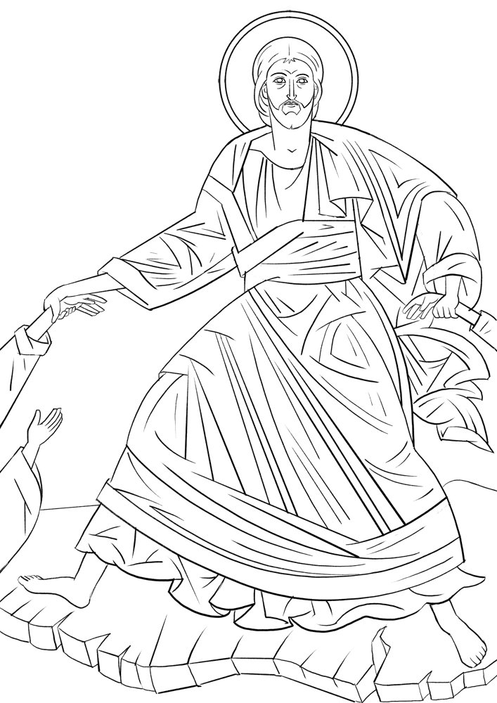 Vous pouvez aussi tout simplement tracer ou colorier l’image simplifiée de Jésus remontant des enfers ci-dessous.