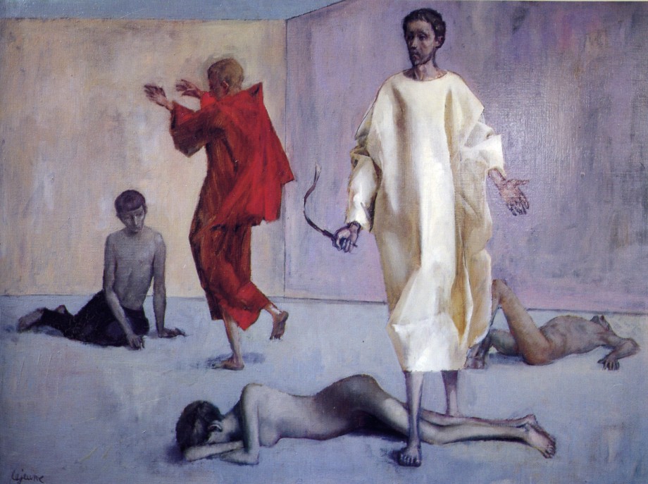 - Philippe Lejeune, 1992, site apsp-palaiseau.fr (Rétrospective Philippe Lejeune), France. Ce peintre français, mort en 2014 à 89 ans, a été formé aux Ateliers d’art sacré (Maurice Denis, Georges Desvallières). Il a fait des vitraux dans plusieurs églises et a fondé l’École d’Étampes. Son œuvre, entre figuration et abstraction, ou l’inverse, s’inscrit dans une recherche spirituelle d’inspiration biblique. Ici, dans un espace dépouillé, on voit Jésus en blanc, avec un fouet, le regard tourné vers l’intérieur. Deux corps nus sont étendus, un homme et une femme. Une figure en rouge est debout en mouvement; un jeune homme est assis par terre, mi-nu. L’œuvre s’offre comme une énigme à déchiffrer ou invite à nous laisser toucher, quelque part dans notre quête.