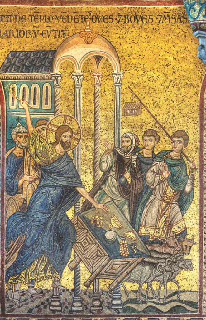 - Mosaïque, c.1180-1190, Cathédrale Santa Maria Nuova, Monreale, Sicile, Italie. Cette église comprend plusieurs mosaïques de style byzantin, dont un cycle sur la vie du Christ. Sur fonds doré, Jésus, en Pantocrator, fouet levé dans la main droite, renverse la table des changeurs de la main gauche. Derrière lui, deux disciples, Pierre et Jean, sont témoins de la scène, pouvant se souvenir et faire des liens avec la Parole. Trois figures, dont l’une tient une cage de colombes, nous regardent plutôt que de regarder Jésus : pour nous faire signe? Sur la table, des monnaies et des vases. Les bœufs et brebis sont là, en bas à droite. À l’arrière, le temple et ses colonnes. Tous les éléments du récit sont présents, sauf les chefs religieux.