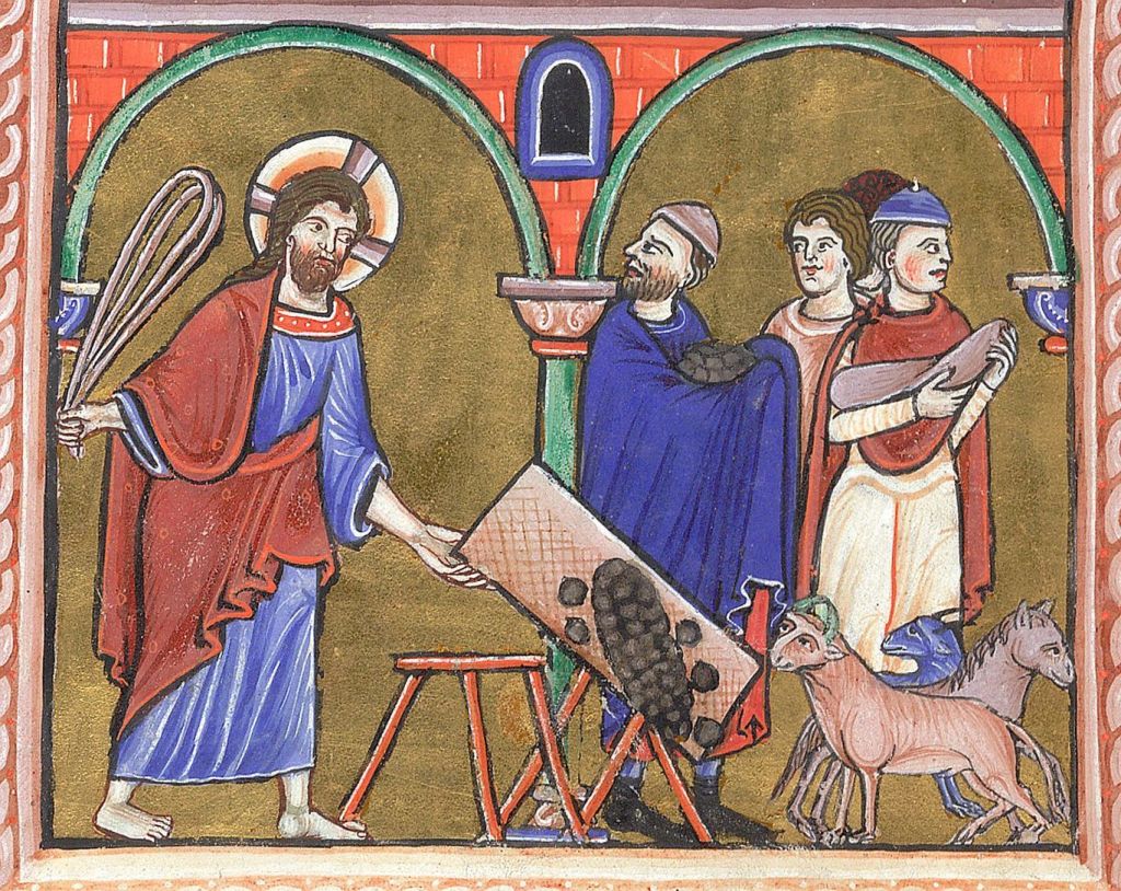- Miniature, c.998, Évangéliaire d’Otton III, Ms Clm 4456, fol. 119v, Bayerische Staatsbibliothek, Munich, Allemagne. Ce manuscrit enluminé a été réalisé par le scriptorium de l’Abbaye de Reichenau pour Otton III, jeune empereur du Saint-Empire. La figure de Jésus reprend celle fréquente dans l’Antiquité : le jeune homme imberbe avec un nimbe cruciforme. Le fouet est levé dans sa main droite. Quatre marchands et changeurs sont tournés vers lui et le regardent; l’un d’eux porte une cage de colombes; une table est renversée. Deux autres s’en vont avec un bœuf; il semble que les brebis soient déjà sorties du cadre! Le temple est plus élaboré. Le tout sur fonds doré et diversité des couleurs.