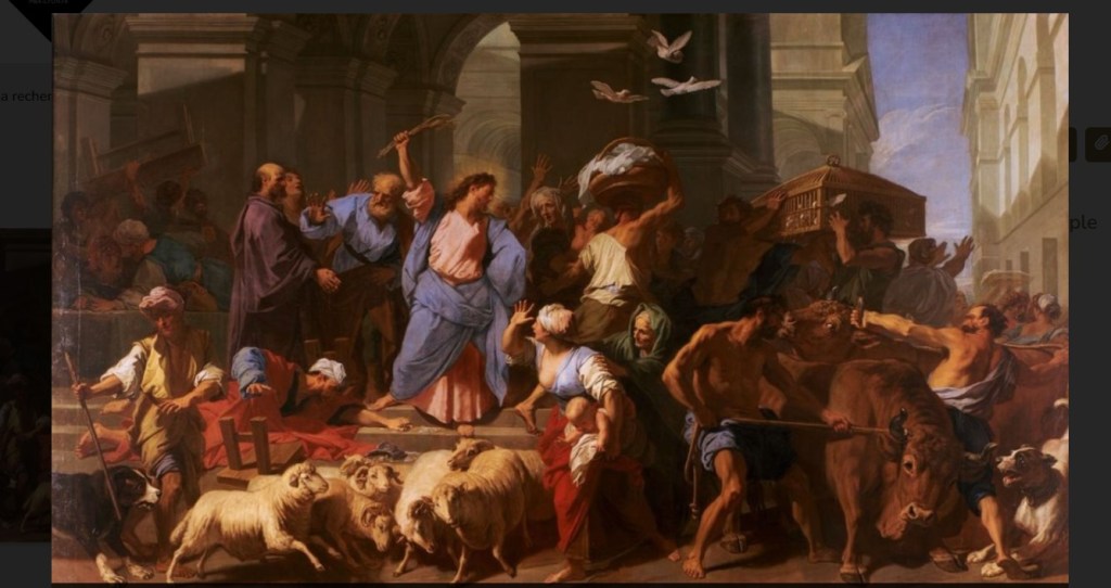 - Jean-Baptiste Jouvenet, c.1706, Musée des Beaux-Arts de Lyon, France. Originaire de Rouen, cet artiste fut formé à Paris chez Charles Le Brun. Il a réalisé plusieurs travaux pour les institutions et résidences liées à la royauté. Ses œuvres religieuses ont été très admirées à son époque. Nous avons ici une scène très vivante, marquée par le sens des couleurs, la précision du dessin, et la composition complexe qui relie tous les éléments, figures et lieux. Les brebis, bœufs et colombes participent à ce mouvement. Le temple, les édifices et la rue offrent un contexte favorable. Jésus, au fouet levé, est central mais fait partie de la scène sans la dominer. À sa gauche, Pierre et d’autres disciples sont près de lui.