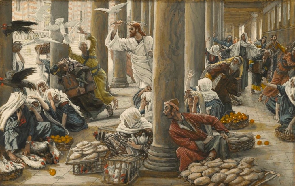 - James Tissot, c.1886-1894, Brooklyn Museum, États-Unis. Ce peintre français, qui a vécu sur place en Terre sainte, est très attentif à l’environnement dans les récits des Évangiles, dont il a illustré un très grand nombre. Nous voyons ici plusieurs colombes qui s’envolent; les brebis et bœufs sont déjà partis! À droite, une longue colonnade avec plusieurs passants et commerçants qui y circulent. À gauche, la main au front, un changeur s’en va avec sa table de service; à droite, des marchands partent avec leurs boites en mains. Il y a aussi des vendeurs de pains et de fruits, inquiets. Jésus est en blanc, selon la coutume de Tissot; mais ici, cette couleur, présente de plusieurs manières, unifie la scène. Le temple est bien montré, de façon plus détaillée.