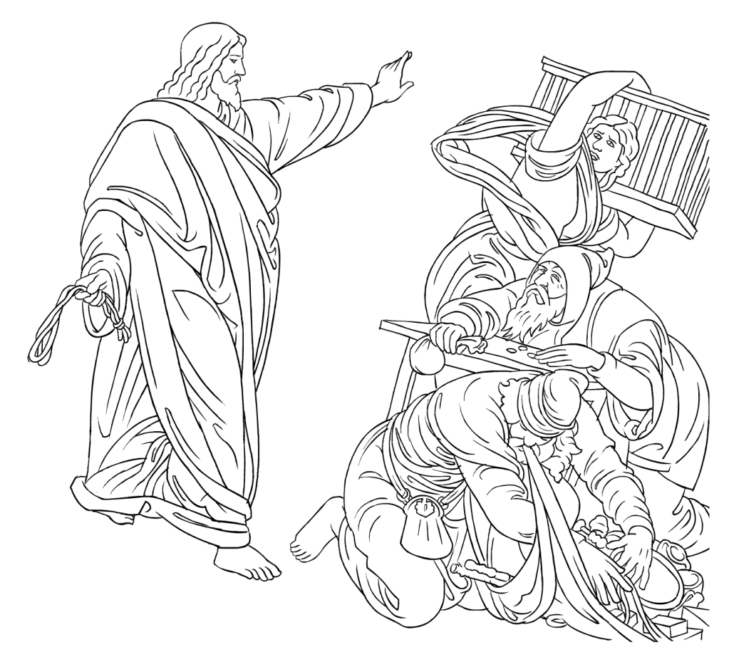 Jésus en est le centre, brandissant un fouet : il peut être montré comme un maitre, plus solennel, ou un prophète, plus virulent. Il est en mouvement. En ces circonstances dramatiques, son visage peut exprimer, ou non, divers sentiments, de la colère à la détermination. Plusieurs figures sont présentes dans ce récit : les marchands, les changeurs de monnaie, la foule, les chefs religieux, les disciples. Certaines peuvent être privilégiées et d’autres absentes. Elles sont habitées par des réactions de choc ou de peur. Il y a aussi des animaux, les brebis et les bœufs, ainsi que des oiseaux, les colombes; les artistes peuvent être inégalement doués pour les montrer. Cela fait beaucoup de monde, qui sont tous en mouvement!