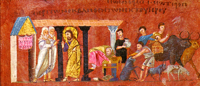 - Miniature, 6e siècle, Évangéliaire de Rossano (Codex Purpureus Rossanensis), Ms EAB 644, Musée diocésain de Rossano, Calabre, Italie. Ce très ancien manuscrit, écrit en grec sur parchemin pourpre, contient les Évangiles de Matthieu et Marc et plusieurs enluminures, de style byzantin, sur la vie du Christ. Originaire d’Antioche de Syrie, il parvint à Rossano au 9e siècle. On voit ici les marchands, chassés, qui s’en vont avec leurs brebis, bœufs et colombes; l’un porte une cage. Les changeurs ramassent leur table et les monnaies, dont certaines sont répandues sur le sol. Jésus, barbu et nimbé, tenant encore le fouet dans sa main gauche, est en discussion avec les chefs religieux. Le temple est évoqué par les colonnes et le toit. Cette miniature comprend tous les éléments du récit, sauf les disciples.
