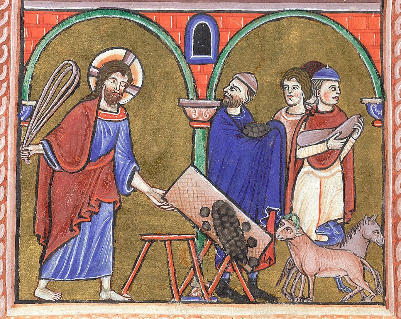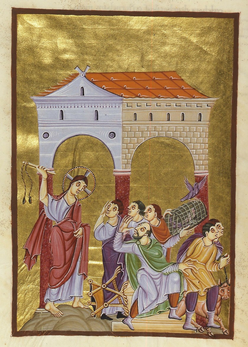 - Miniature, c.998, Évangéliaire d’Otton III, Ms Clm 4456, fol. 119v, Bayerische Staatsbibliothek, Munich, Allemagne. Ce manuscrit enluminé a été réalisé par le scriptorium de l’Abbaye de Reichenau pour Otton III, jeune empereur du Saint-Empire. La figure de Jésus reprend celle fréquente dans l’Antiquité : le jeune homme imberbe avec un nimbe cruciforme. Le fouet est levé dans sa main droite. Quatre marchands et changeurs sont tournés vers lui et le regardent; l’un d’eux porte une cage de colombes; une table est renversée. Deux autres s’en vont avec un bœuf; il semble que les brebis soient déjà sorties du cadre! Le temple est plus élaboré. Le tout sur fonds doré et diversité des couleurs.