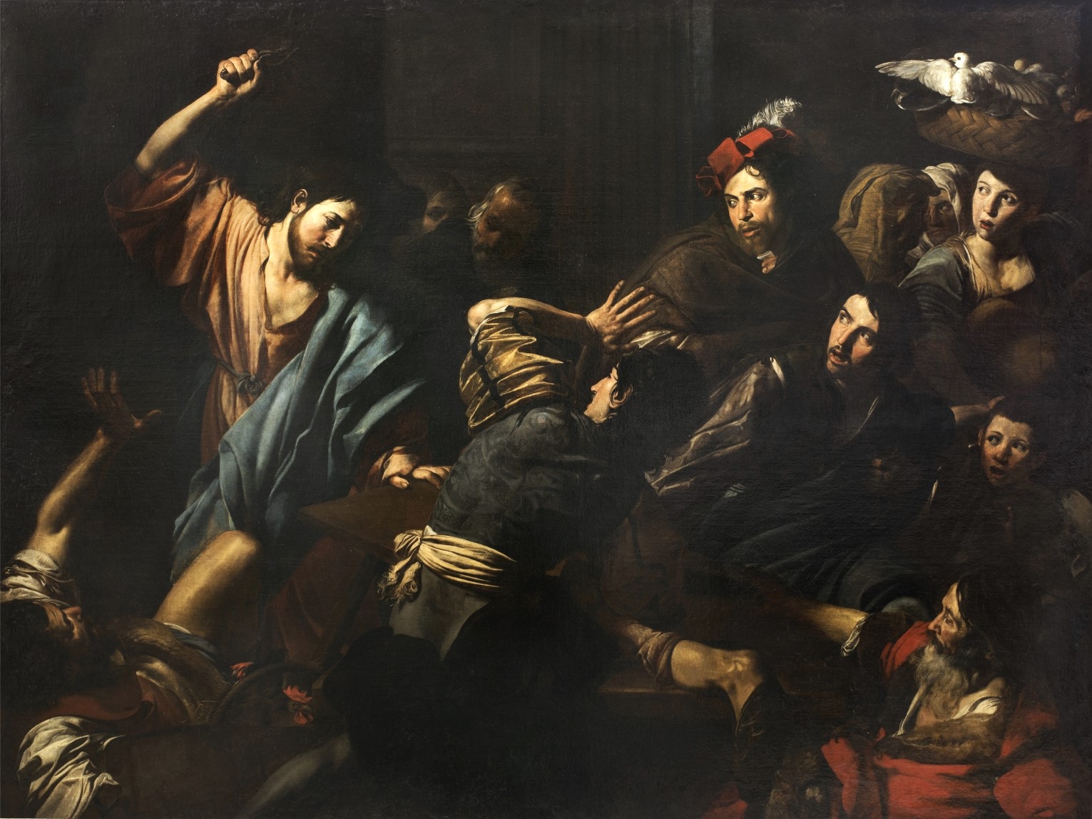 - Valentin de Boulogne, c.1618-1622, Galerie nationale d’Art antique (Barberini-Corsini), Rome, Italie. Ce peintre français a été formé à l’atelier de son père, puis en Italie chez Simon Vouet. Installé à Rome, à l’évidence il fut fortement influencé par Le Caravage : son clair-obscur, ses personnages issus du peuple, son sens dramatique. Ici, pas d’élément architectural, ni d’objets, ni d’animaux, sauf une colombe en haut à droite. Seulement des visages, dans la lumière et l’ombre. Ils sont tous tournés vers Jésus, le regardant avec effroi ou stupéfaction. Celui-ci, au fouet levé, est résolu dans son action, mais ne montre pas d’expression aisément lisible. Dans une œuvre de 1626, sur le même sujet, on retrouve des éléments semblables, mais avec une intensité dramatique et une obscurité plus soulignées.